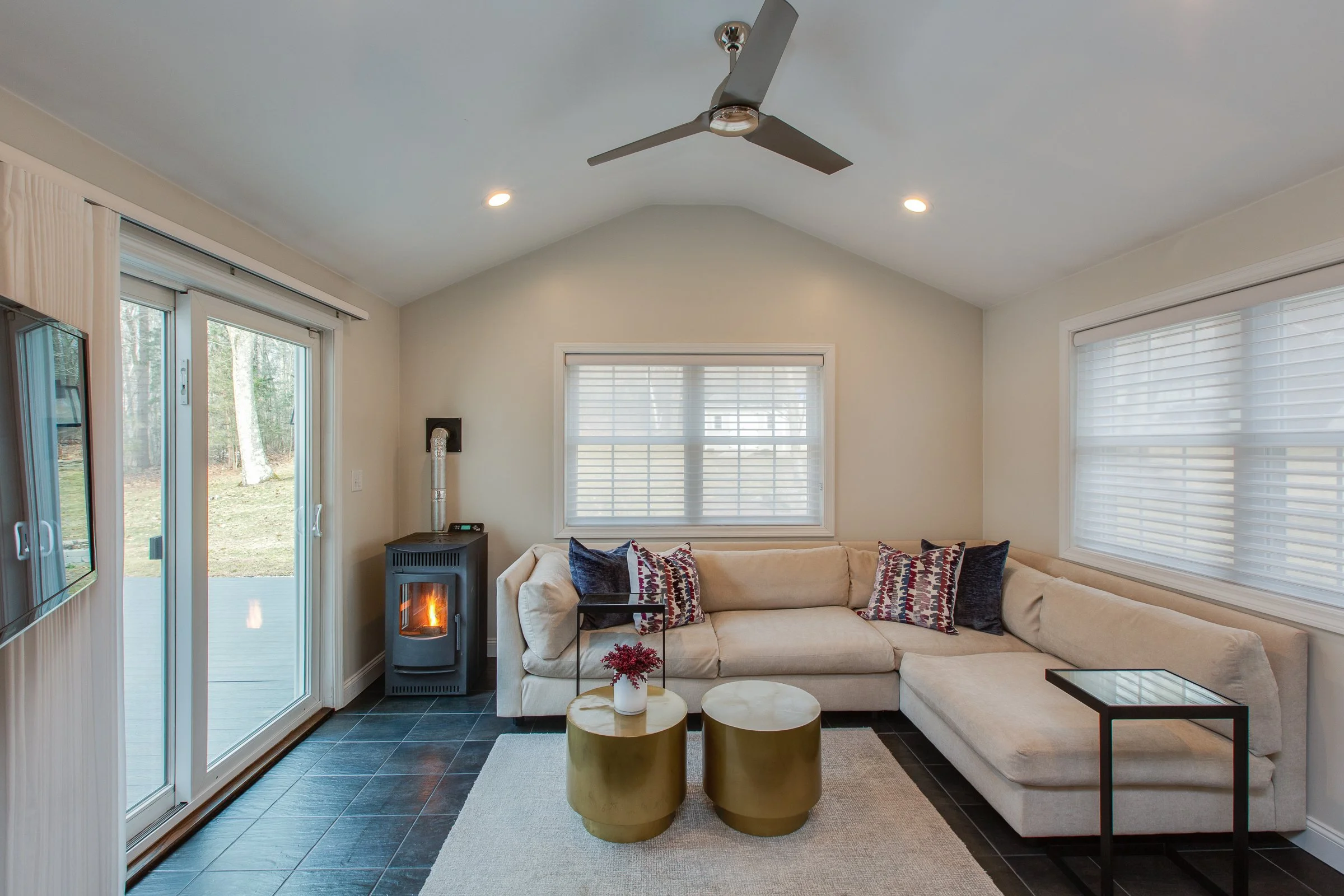 This Pelham, New Hampshire sunroom sits directly off the kitchen, so the goal was simple: turn it into a casual, comfortable TV and lounge space that would feel like a true extension of the home - not just a seasonal room that only gets used a few months a year.