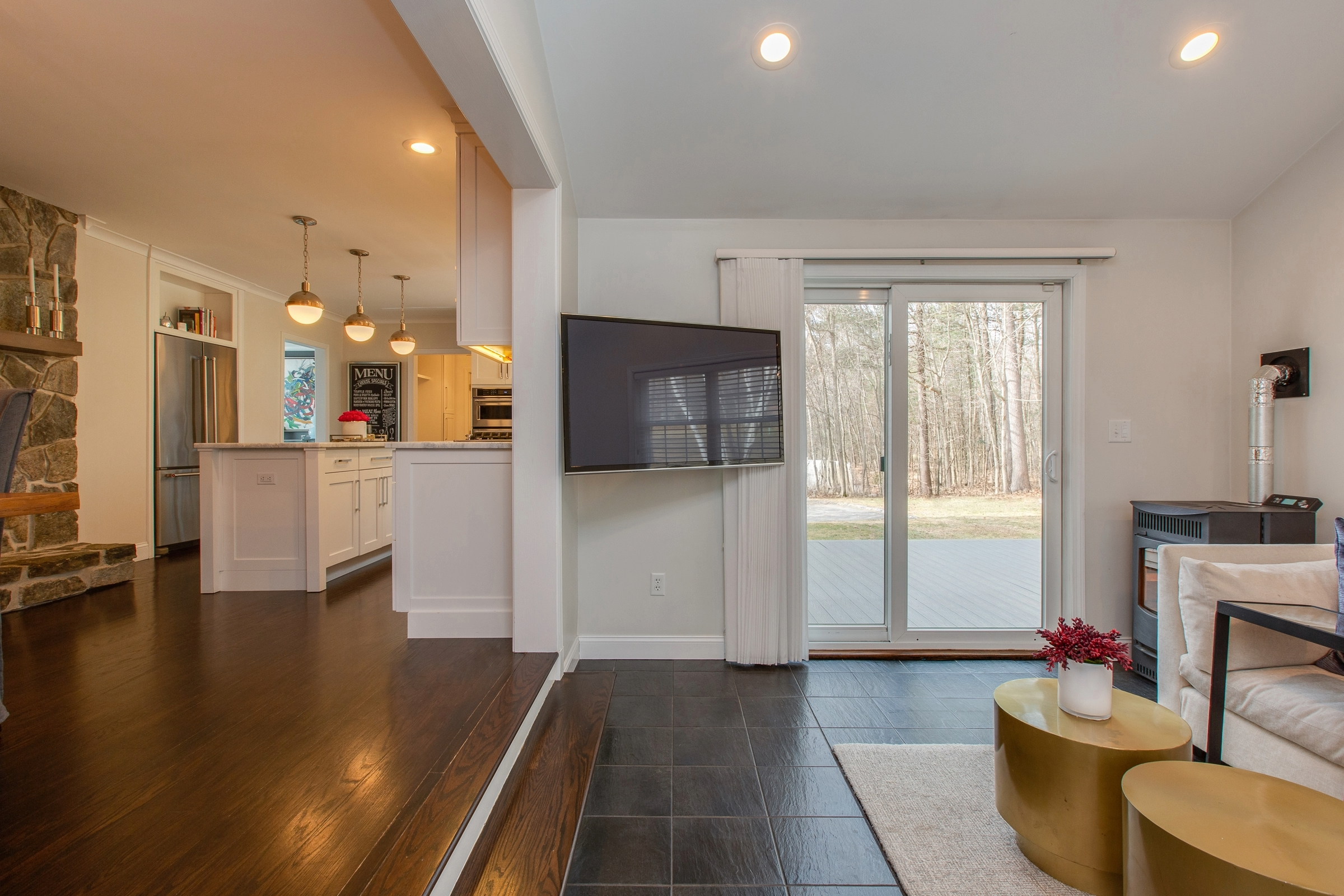 We removed the slider entirely and eliminated the stone step, replacing both with a full cased opening that visually ties the sunroom into the rest of the first floor.